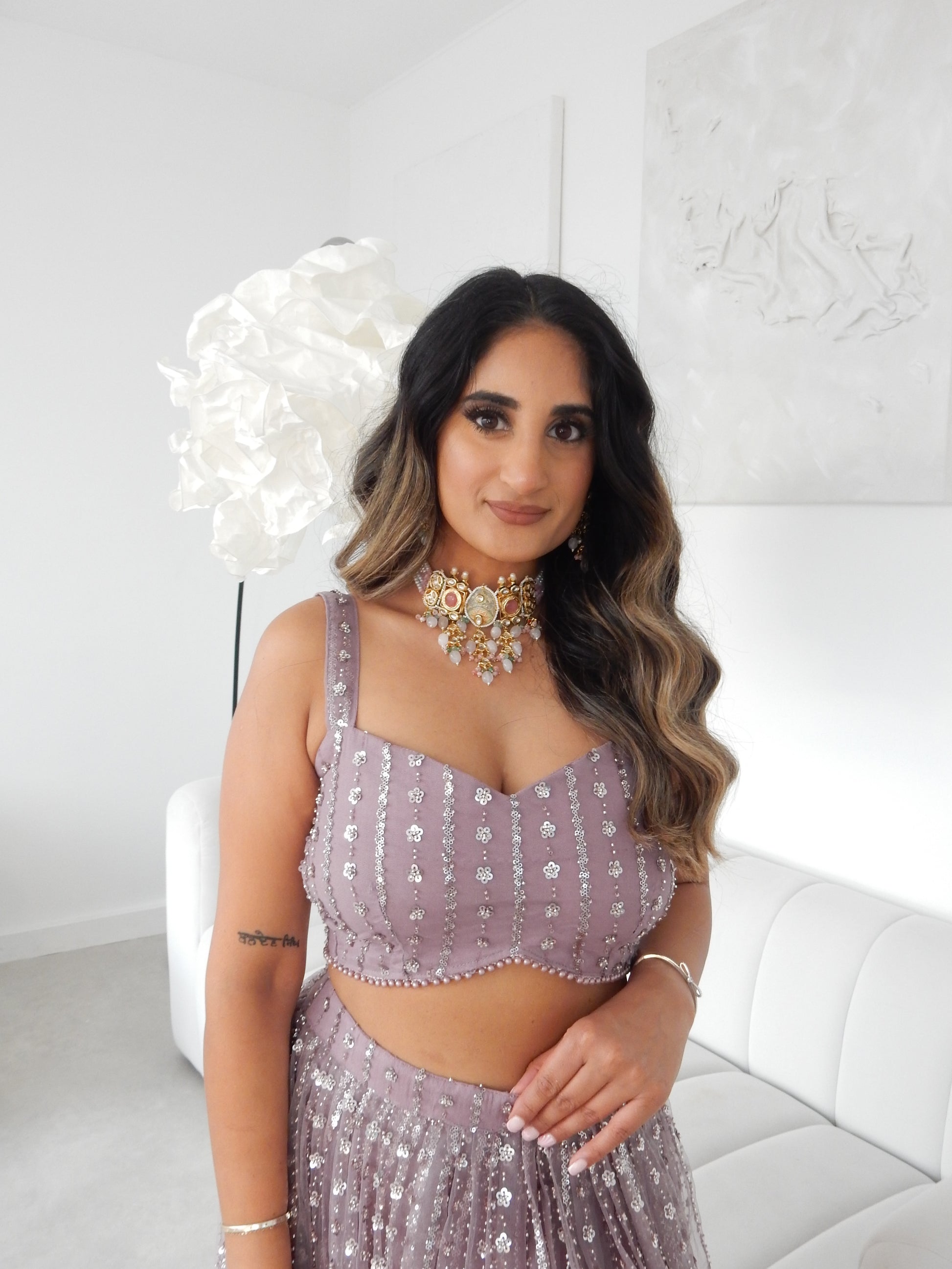 Experience elegance and royalty with Our Purple Lehenga. Complete with stunning sparkles and delicate pearl detailing on the blouse and skirt, this lehenga is perfect for any traditional South Asian wedding occasion. Embrace your inner sparkle and turn heads wherever you go with this gorgeous piece.